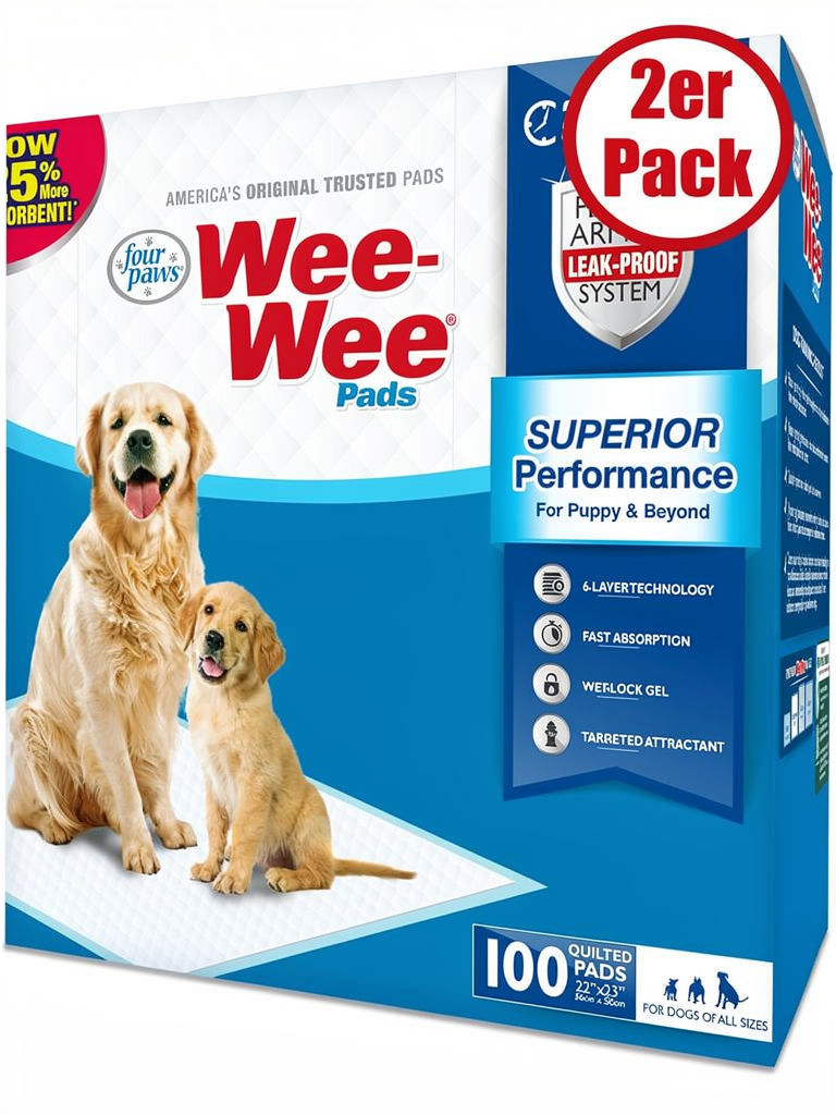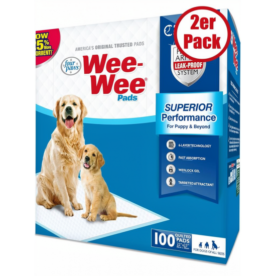 2er Pack Four Paws Wee-Wee Superior Performance Pee Pads – 100er Pack, 22" x 23" (ca. 56 x 58 cm), saugstarke Trainings- und Hygienematten für Hunde