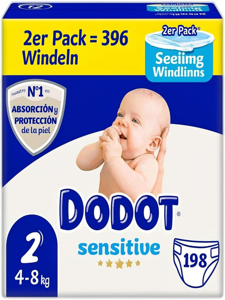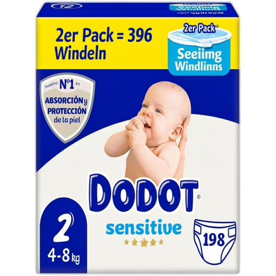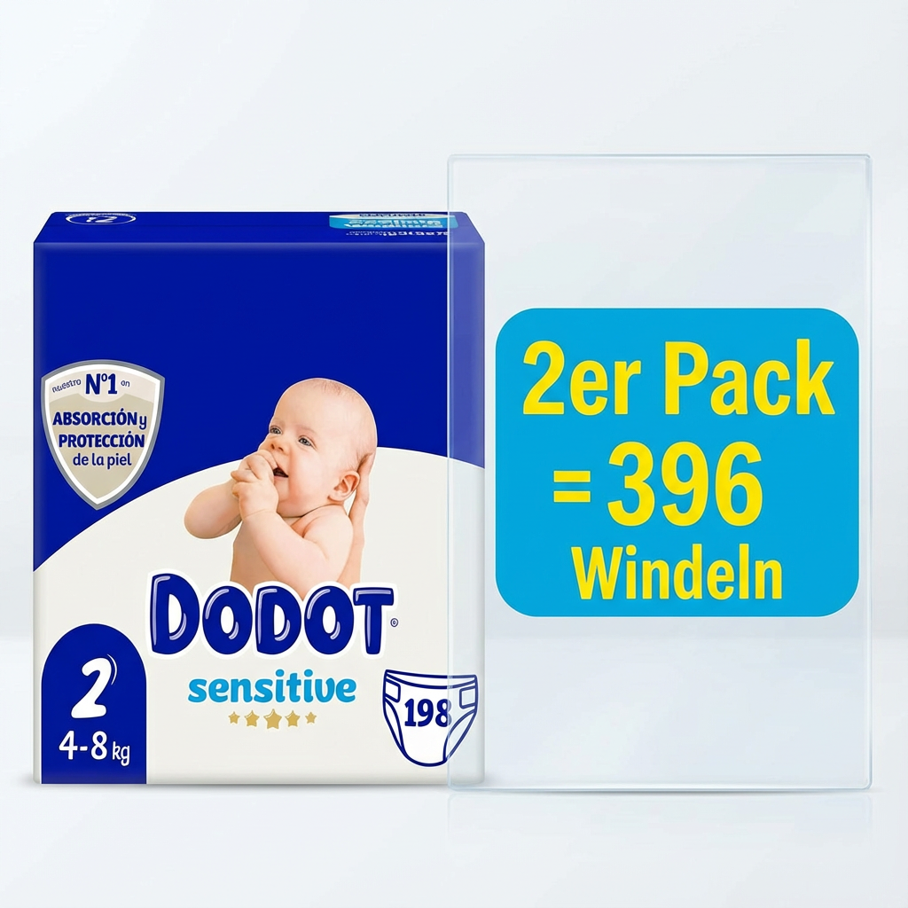 2er Pack Dodot Sensitive Babywindeln Größe 2 (4–8 kg) – je 198 Stück, Monatsbox