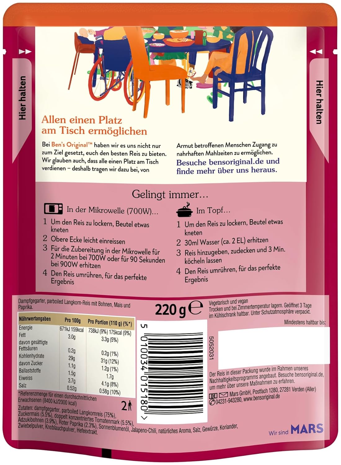 Zutaten: dampfgegarter, parboiled Langkornreis (78%), doppelt konzentriertes Tomatenmark (5.4%), Adzukibohnen (4.0%), Zuckermais (4.0%), roter Paprika (2.4%), Sonnenblumenöl, Gewürze (Chilipulver), Zwiebelpulver, natürliches Aroma, Salz, Koriander, Knoblauchpulver, Hefeextrakt.