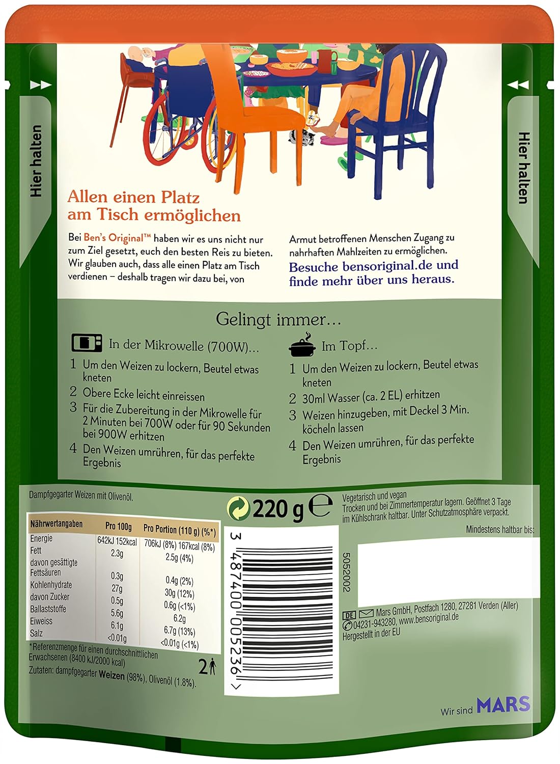 BEN’S ORIGINAL ist fest davon überzeugt, dass jeder es verdient hat, sich willkommen zu fühlen, gehört zu werden und Zugang zu nahrhaftem Essen zu haben – und aus diesem Grund haben wir uns der Aufgabe verschrieben, Mahlzeiten und Erlebnisse zu kreieren, die jedem einen Platz am Tisch bieten. Ben's Original Sonnenweizen ist schonen Dampfgegarter Sonnenweizen und eine hervorragende Quelle für pflanzliche Ballaststoffe & Proteine.