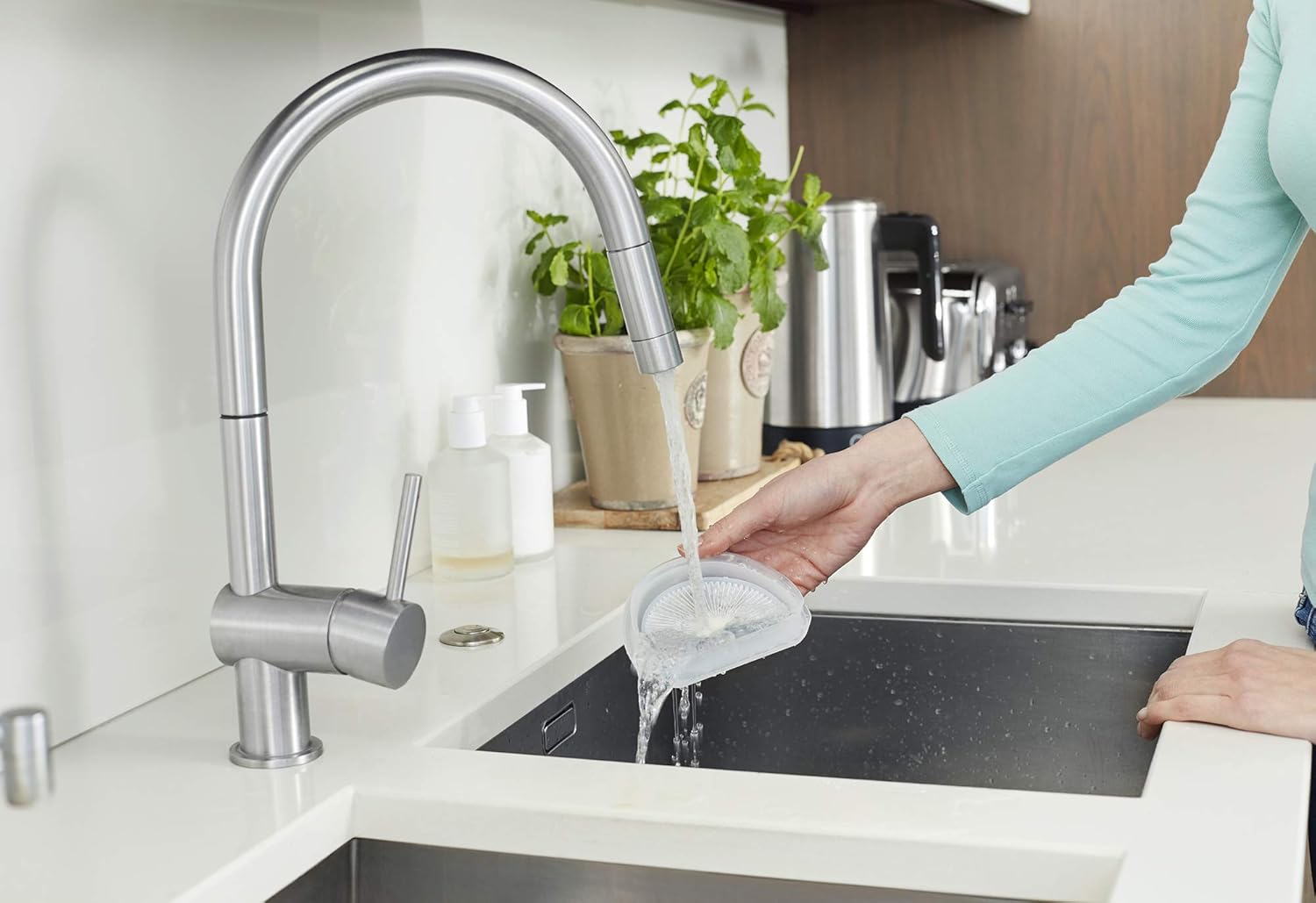 - Schmutzfangbehälter: Lässt sich auf Knopfdruck entfernen und ist spülmaschinenfest