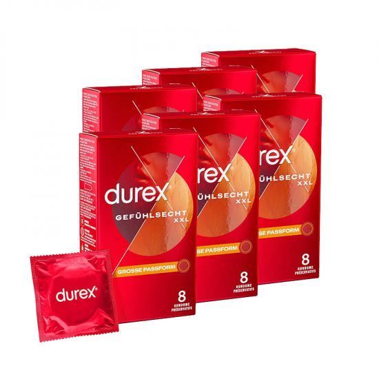 - LIEFERUMFANG: Im Lieferumfang enthalten sind 6 x 8 Stück original Durex Gefühlsecht XXL Kondome