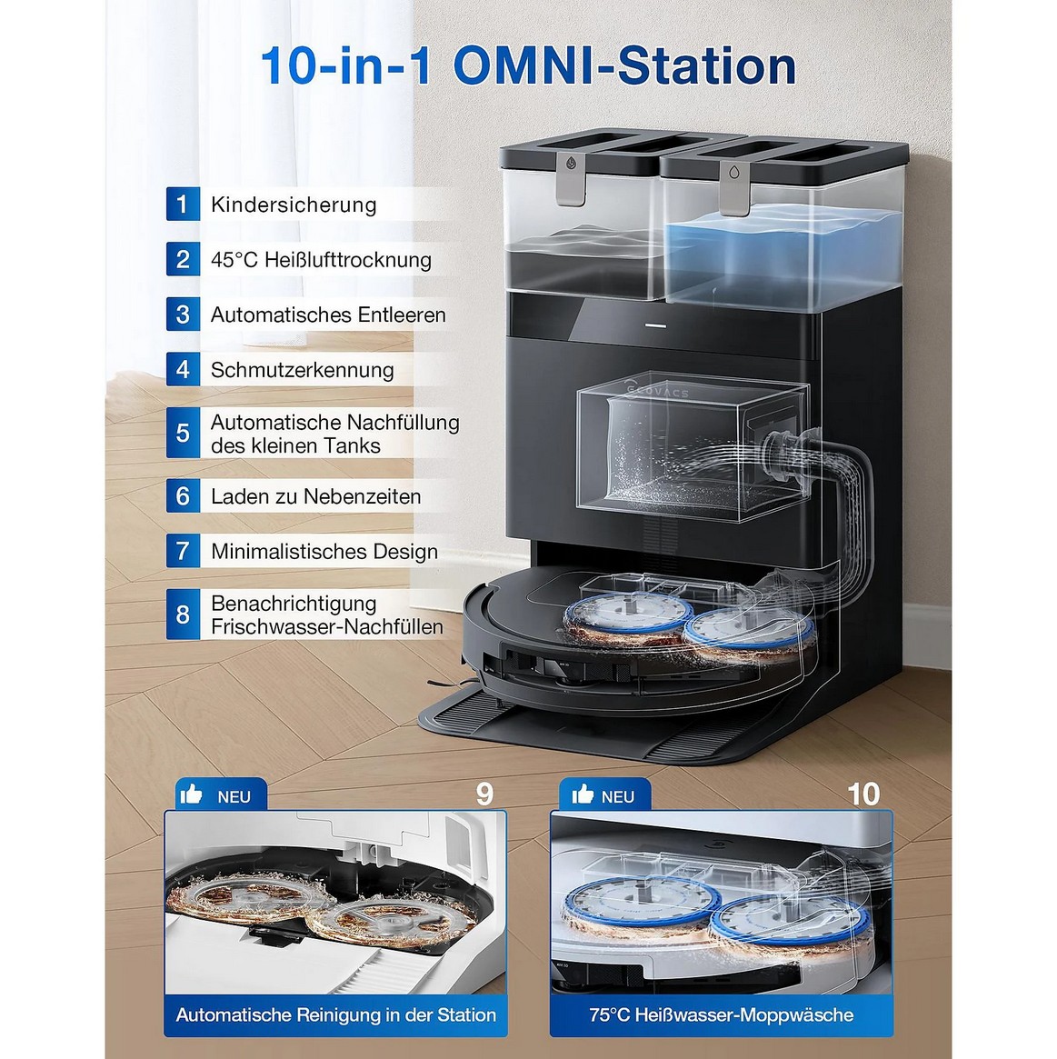- ALL-IN-ONE OMNI-STATION: Die optimierte Multifunktionsstation unterstützt das Auswaschen der Wischmopps mit 75 °C heißem Wasser, entleert automatisch Staub und Schmutzwasser.