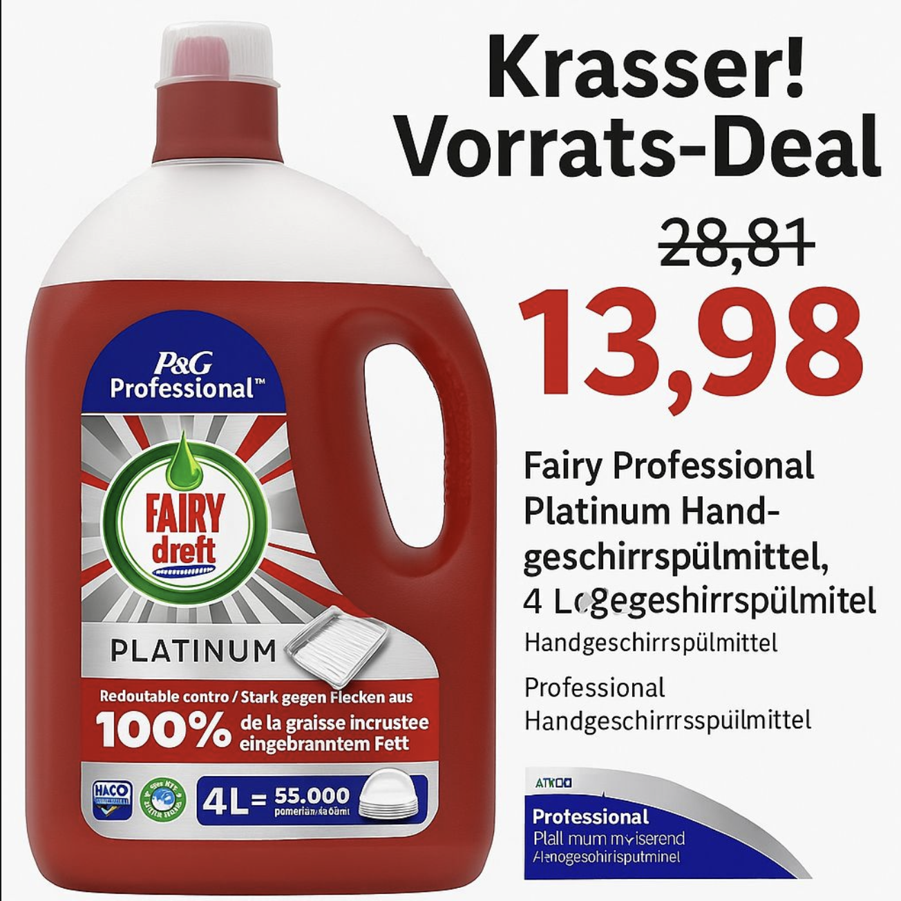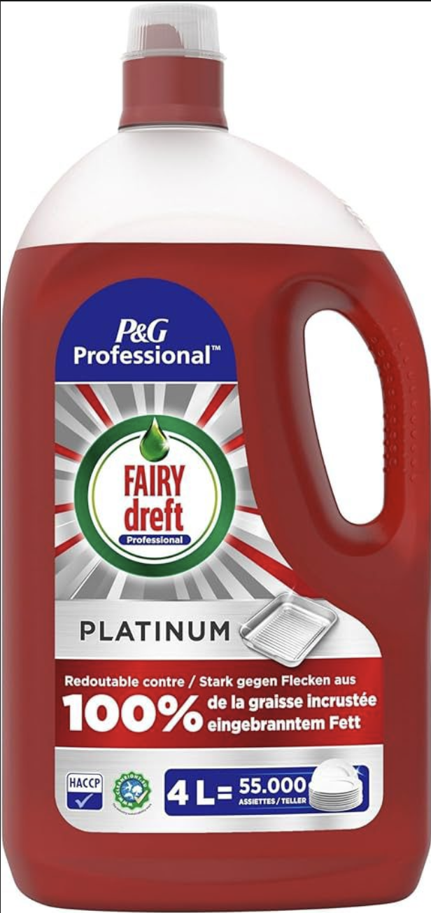 Verbessern Sie die professionelle Reinigung mit Fairy Professional Platinum, der besten Formel von Fairy Professional gegen Fett. Dank der konzentrierten Formel entfernt Fairy Professional selbst hartnäckigste eingebrannte Fettreste wie Käse, Fleisch und Lasagne mit 50 Prozent weniger Arbeit* und hinterlässt Ihre Küche blitzblank. Dieses Produkt garantiert eine makellose Reinigung und Glanz selbst bei kalten Temperaturen (20 °C). Reinigt bis zu 55,000 Teller mit einer 4-L-Flasche**. *vs. nur Wasser **Basierend auf einer empfohlenen Dosierung von 20 ml pro 40–50 L im Spülbecken