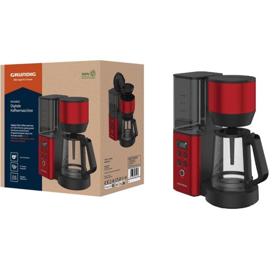 Die Grundig KM 8440 digitale Filterkaffeemaschine kombiniert elegantes Design mit moderner Technik für perfekten Kaffeegenuss. Mit 1150 W Leistung und 1,25 l Fassungsvermögen bereitet sie bis zu 10 Tassen aromatischen Filterkaffee zu. Die programmierbare Startfunktion ermöglicht dir, den Brühvorgang zeitgenau zu planen – ideal für frisch gebrühten Kaffee am Morgen. Über das LCD-Display mit Digitaluhr behältst du jederzeit Kontrolle über alle Funktionen. Die einstellbare Brühstärke und eine optimale Brühtemperatur von 95 °C sorgen für individuellen Geschmack und volles Aroma. Die Warmhaltefunktion hält den Kaffee auf idealer Temperatur, während sich das Gerät nach Gebrauch automatisch abschaltet. Der herausnehmbare Permanentfilter und die Tropfstoppfunktion machen die Reinigung einfach und verhindern ungewolltes Tropfen. Mit Wasserstandsanzeige, Messlöffel und robuster Glaskanne bietet die KM 8440 hohen Bedienkomfort. Das leuchtend rote Gehäuse setzt einen stilvollen Akzent in jeder Küche – für frischen, heißen und aromatischen Kaffee auf Knopfdruck. Hersteller: Beko Germany GmbH, Rahmannstraße 3, 65760 Eschborn, Deutschland, Kundenservice: https://www.grundig.com/de-de/service/support