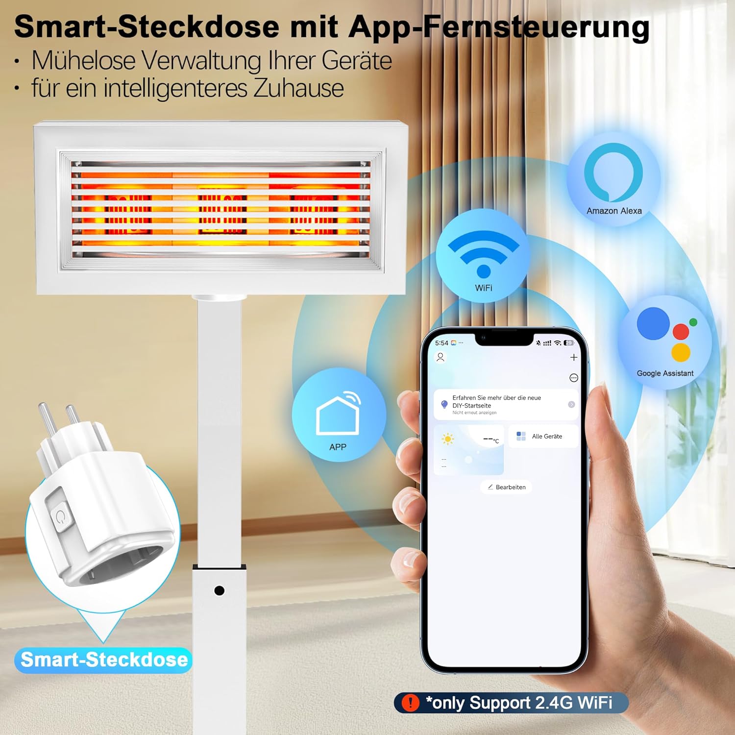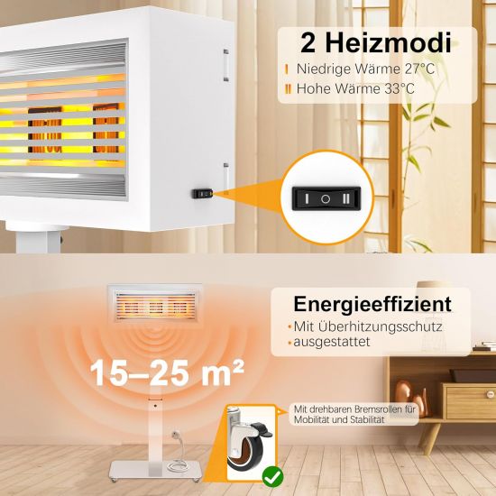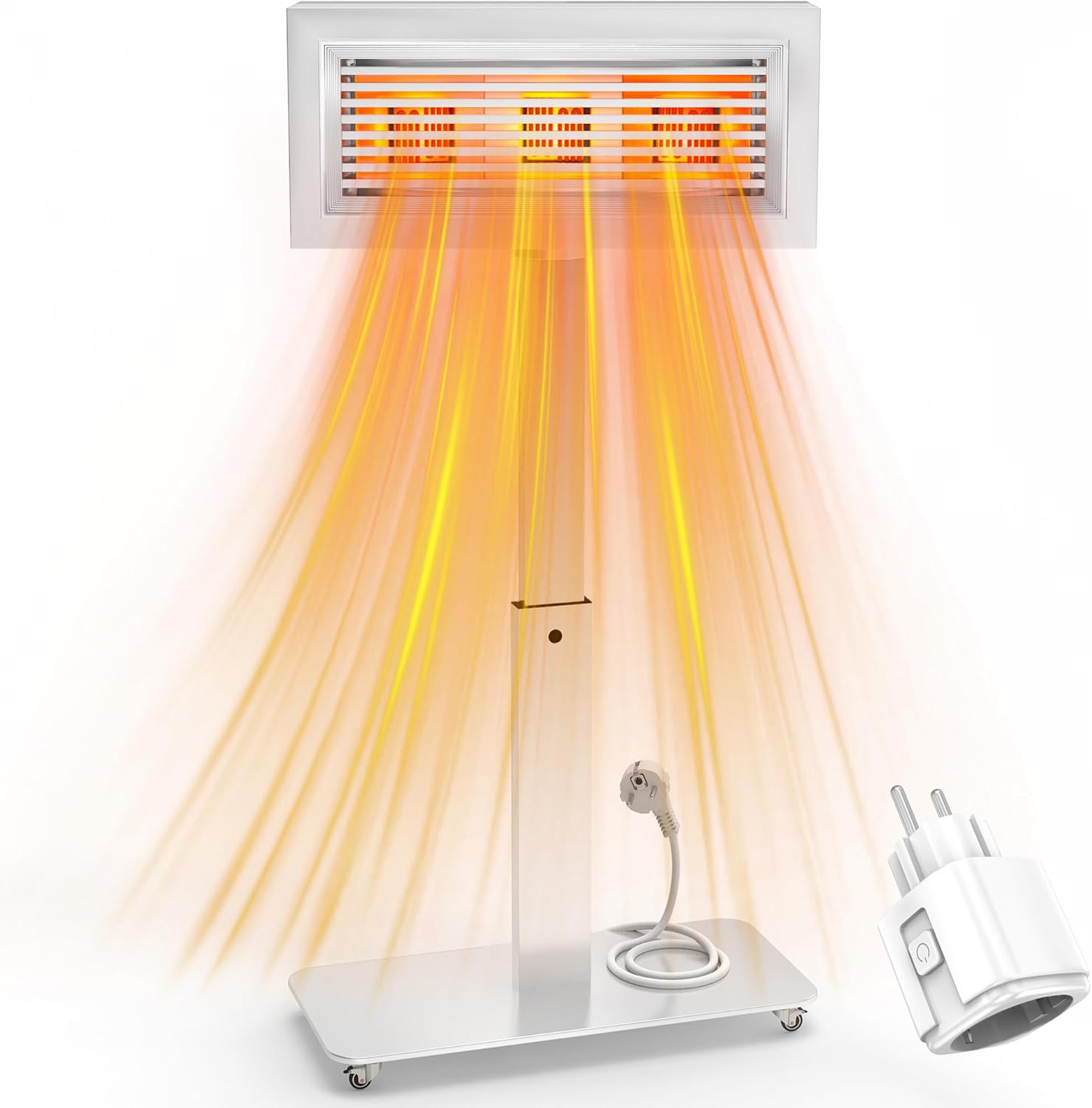 Die Heizung ist mobil, höhenverstellbar und eignet sich ideal für Räume mit einer Größe von 10–20 m². Zusätzlich ermöglicht die Smart-Steuerung per App eine komfortable Bedienung. Die Aufheizzeit beträgt weniger als 2 Minuten.