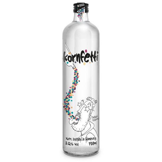 Kornfetti - Der Buntermacher. Extrem Mild durch den extragroßen Malzanteil. Abgefüllt von Hand in Hamburg. Korn verbunden mit Kunst, designed by Bobbie Serrano. Vielseitig in Longdrinks oder Cocktails einsetzbar und pur als Shot extrem lecker. Trinkempfehlung: Als Shot bzw. pur empfehlen wir eine Trinktemperatur 10-16 C° In einem Longdrink gern mit Eiswürfeln eisgekühlt, empfehlen wir als Cocktail z.B den Kornfetti Basil Smash und als Longdrink z.B. mit Soda & Limette oder Tonic & Zitrone. Herkunft: Weizen, zu 100% aus deutschem Anbau, verfeinert mit samtweichem Wasser aus der Nordheide. Designt und abgefüllt in Hamburg Altona. Herstellung: Die Herstellungsweise und das Mundgefühl des fertigen Destillats ähnelt dem eines jungen Whiskys dem white dog. Das verdankt Kornfetti dem guten alten Malzzucker, der unter dem Einsatz von Amylase aus der Getreidestärke entstanden ist. Der hohe Malzanteil sogt für eine coole Feinlieblichkeit und einer überraschend zarten Nussigkeit im Abgang. Das so entstandene, bereits äußerst schmackhafte Rohdestillat wird anschließend mit samtweichem Wasser aus der Nordheide schonend auf Trinkstärke eingestellt, von Hand filtriert und schlussendlich mit viel Liebe und zu lauter Musik in Hamburg Altona abgefüllt. Hersteller: Kornfetti GmbH, Schulterblatt 58, 20357 Hamburg, Deutschland