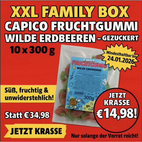 Capico Fruchtgummi „Wilde Erdbeeren“ gezuckert 10 x 300g XXL Family Box (Mindesthaltbarkeit 24.01.2026)