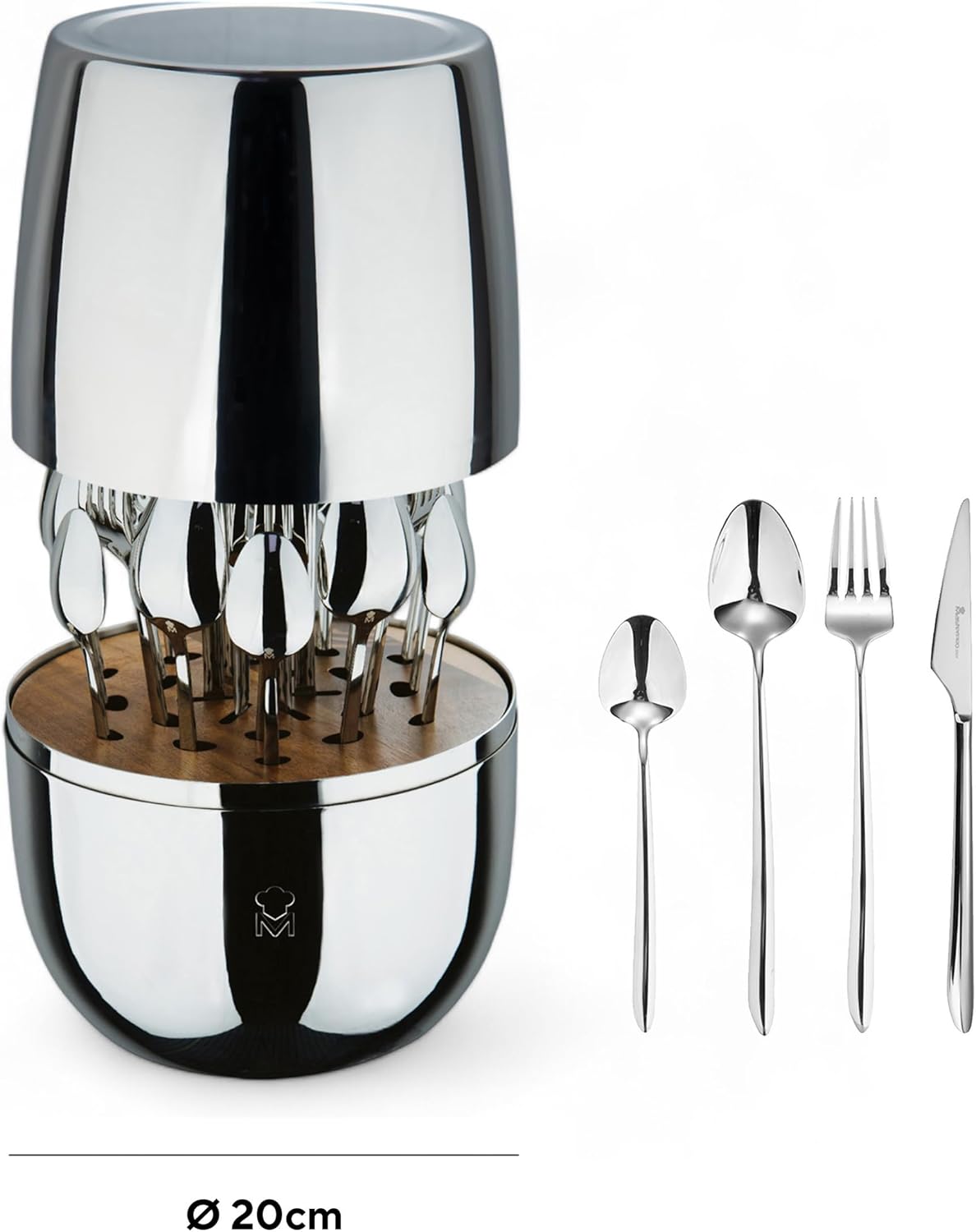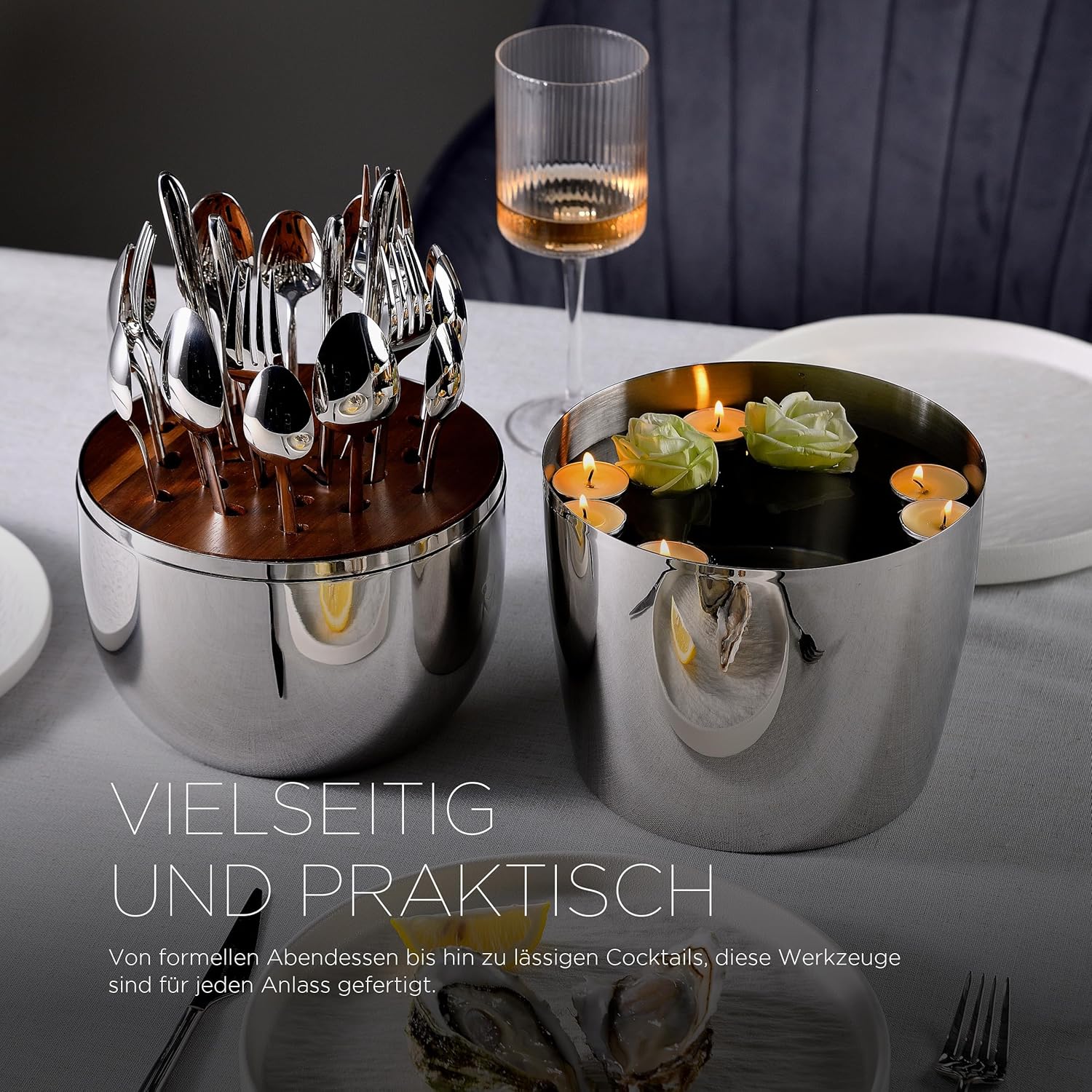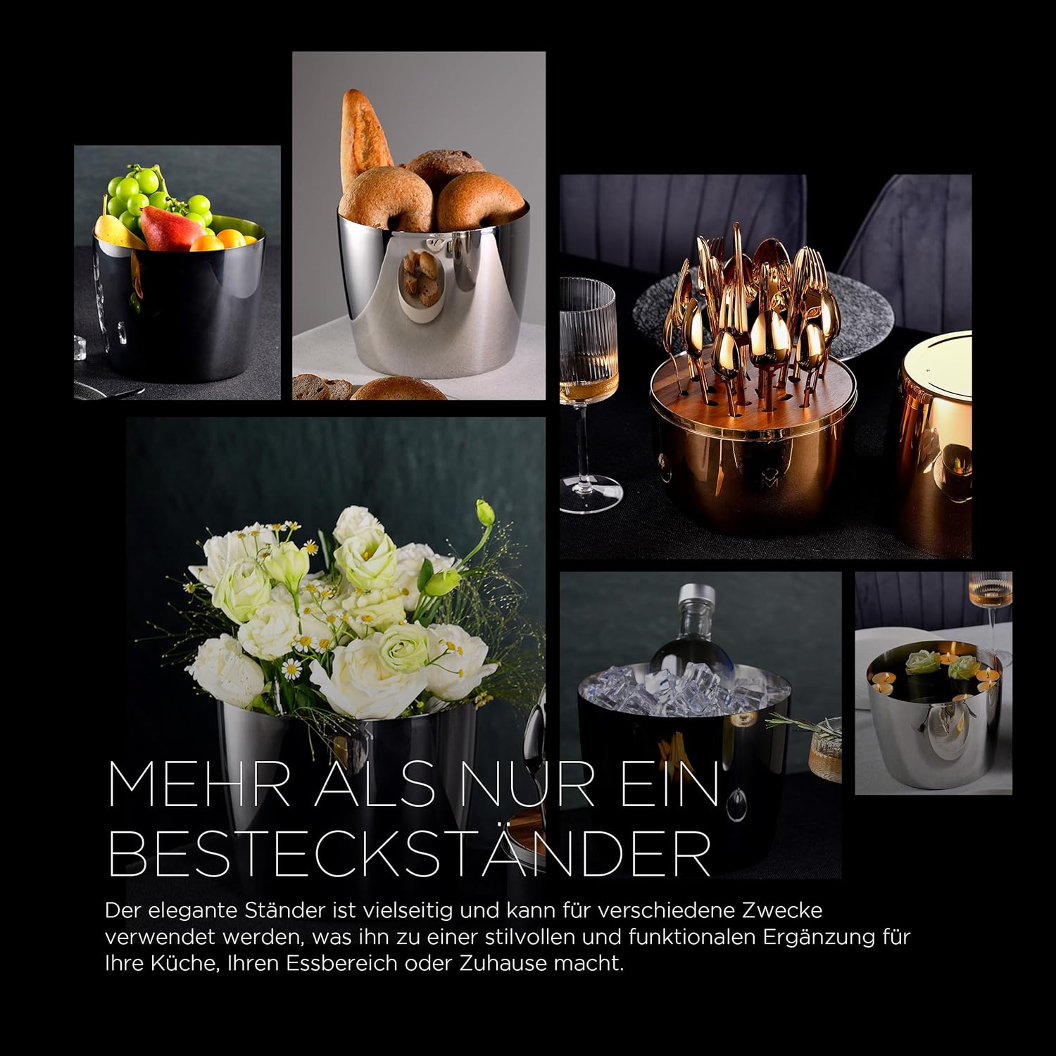 Das Besteck steht gesammelt und griffbereit im passenden Halter – ideal für Buffet, Küche, Esstisch oder Terrasse. Kein wildes Schubladengestöber mehr. -