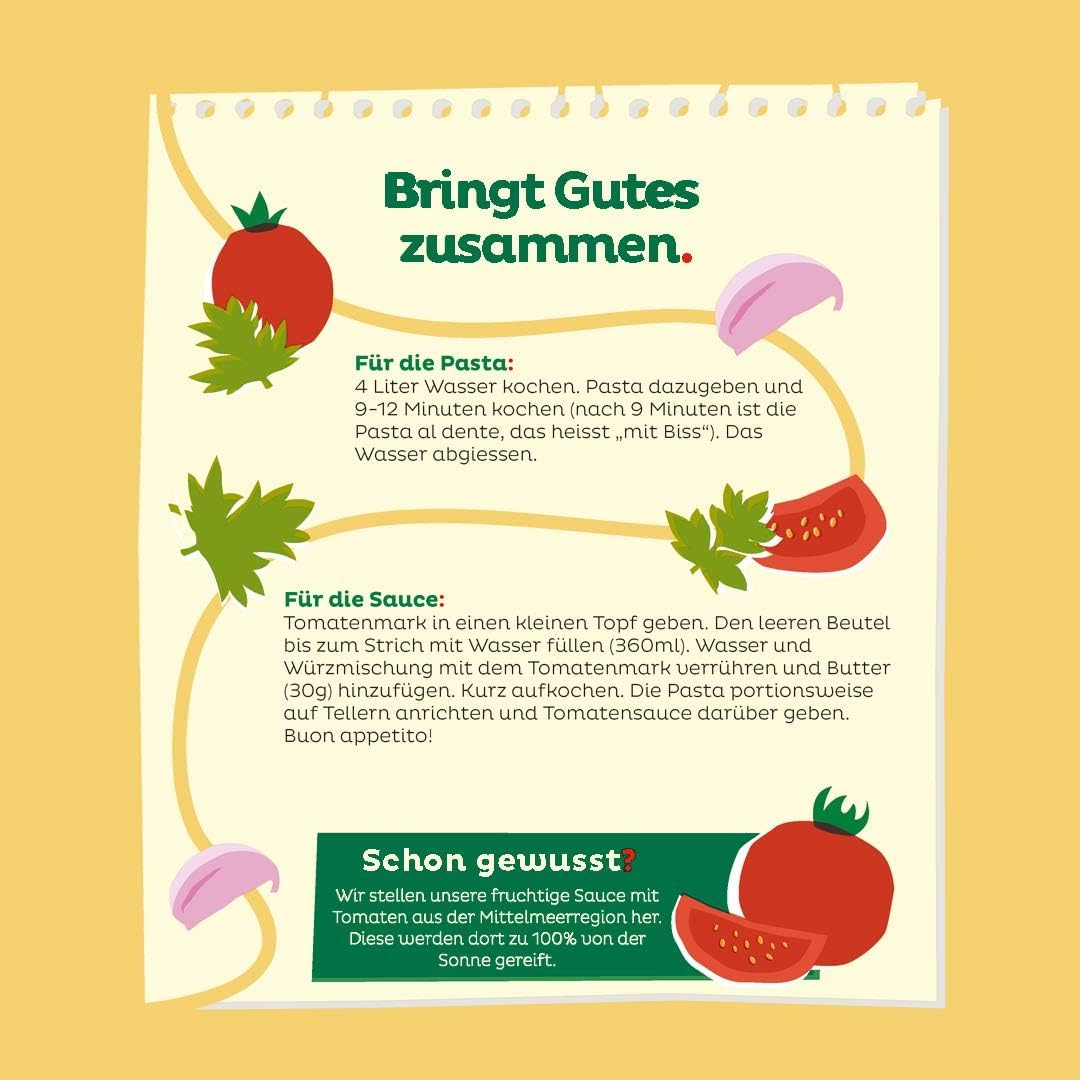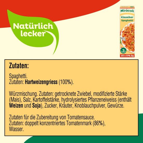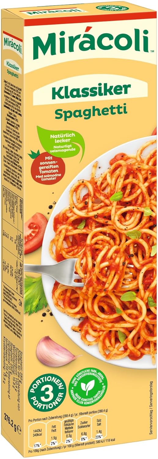 MIRÁCOLI Klassiker Spaghetti mit Tomatensauce ist der Pasta-Klassiker von MIRÁCOLI nach original italienischem Rezept. Seit der Markteinführung 1961 wurde er kontinuierlich verbessert, aber eines ist immer gleich geblieben: die einfache und schnelle Zubereitung. Nicht geheim: wo die frischen Tomaten herkommen. Die reifen nämlich in der warmen Sonne des Mittelmeeres. Mit Kräutern und Zwiebeln verfeinert, verleiht die klassische Sauce den Spaghetti ein mediterranes Aroma. Für ein köstliches Mittagessen mit der Familie oder wenn's mal schnell gehen muss.