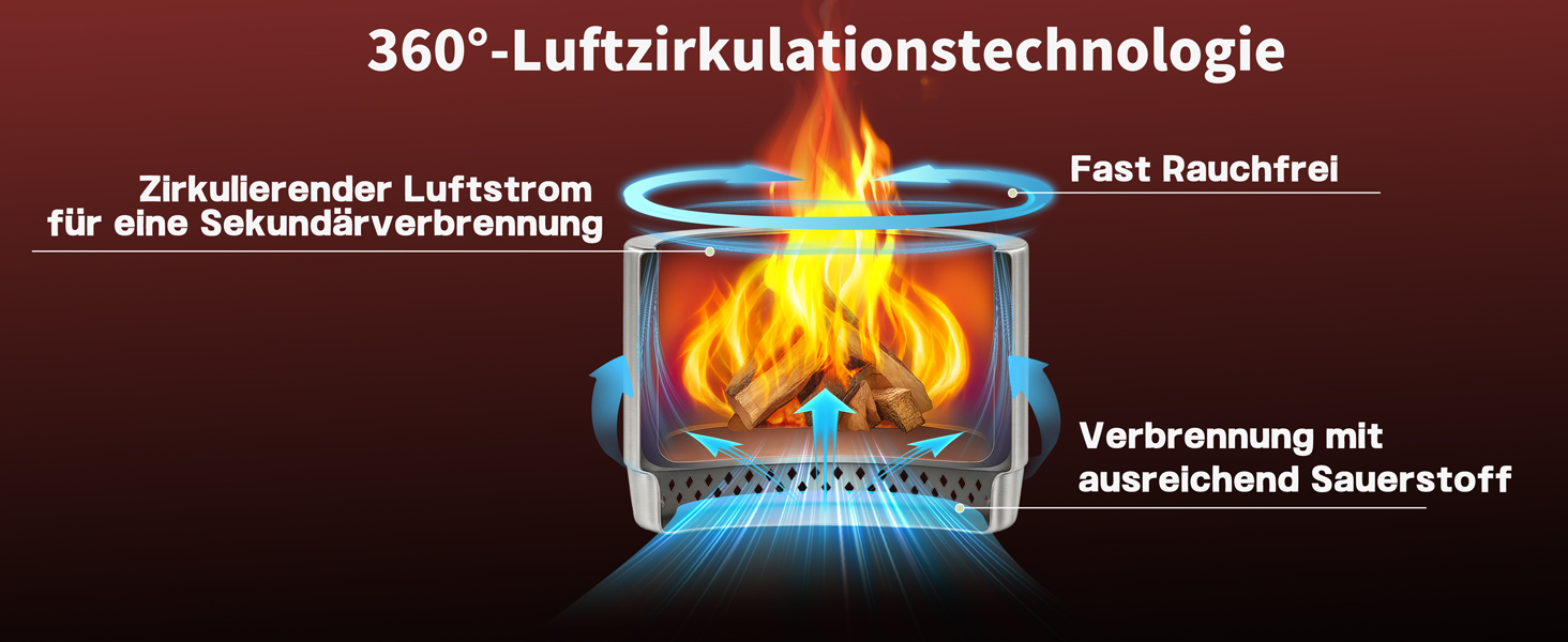 - Innovatives Design: Mit dem 360°-Luftzirkulationssystem wird der Brennstoff vollständig verbrannt, die Rauchentwicklung um bis zu 70 % reduziert und der Materialverbrauch deutlich verringert.