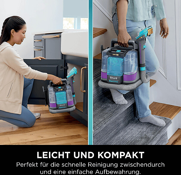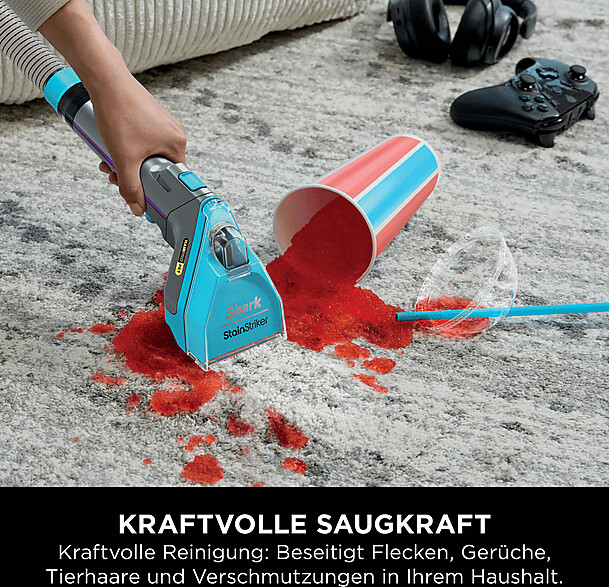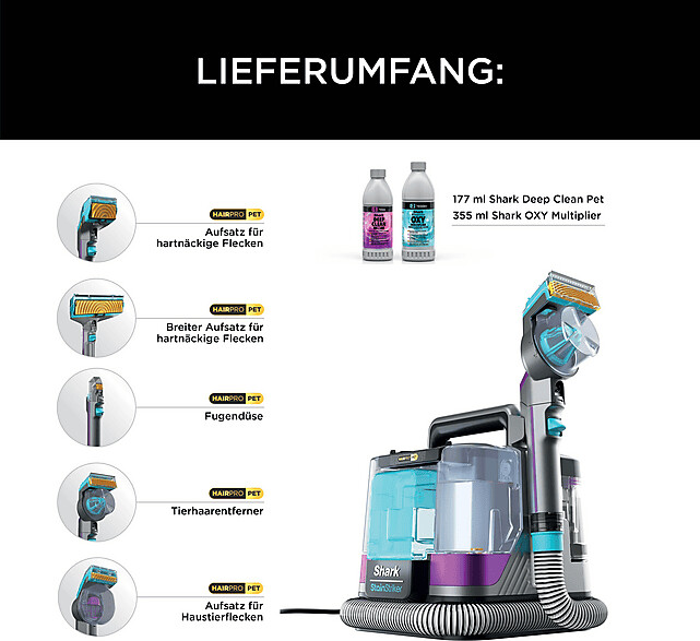 Der Shark StainStriker HairPro Pet wurde speziell für Haushalte mit Haustieren entwickelt. Hartnäckige Verschmutzungen wie Tierurin, Schlamm, Futterreste oder eingetretene Flecken auf Teppichen, Polstern, Treppen oder im Auto werden gezielt behandelt.