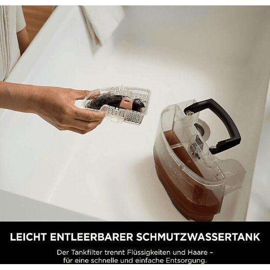 Mit Auffangbehälter und Anti-Verwicklungs-Lamellen zum Aufsaugen von Haaren und Schmutz oder in Kombination mit der Sprühfunktion zur Flecken- und Geruchsentfernung. -