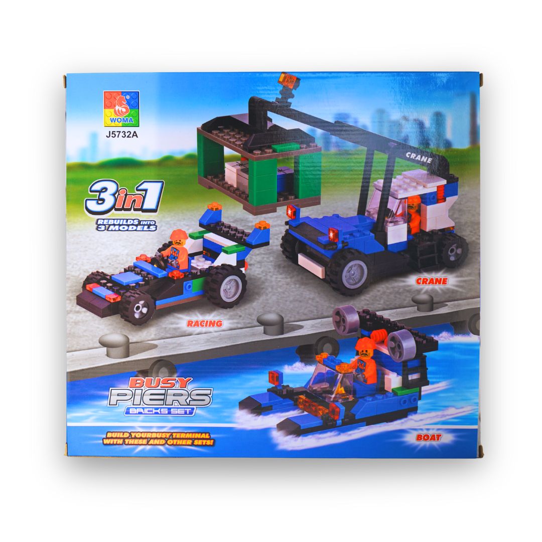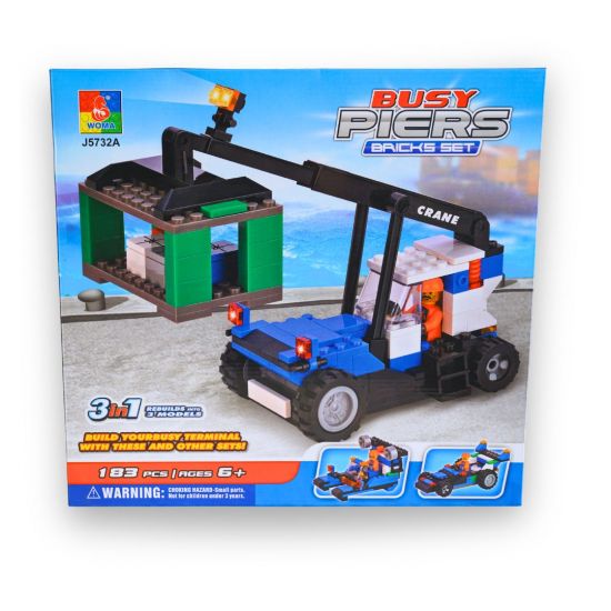 Mit dem WOMA Busy Piers J5732A entsteht ein spannendes Hafen- und Logistik-Set aus 183 Teilen. Das Set enthält ein detailreiches Kranfahrzeug, eine kleine Terminal-Station sowie verschiedene Umbauoptionen. Dank 3-in-1 Design kann das Modell zu drei unterschiedlichen Fahrzeugen umgebaut werden – ideal für kreative Kids, die Abwechslung lieben.